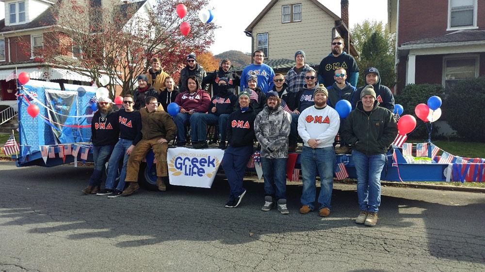 Penn College's Phi Mu Delta fraternity participated in Saturday's Veterans Day Parade in South Williamsport, honoring the nation's military personnel past and present. More than 25 participants from the chapter spent the afternoon handing out candy and beads, spreading cheer and singing songs from their homemade float on a General Services-provided trailer. With help from Andrea L. Mull, horticulturist/grounds and motorpool supervisor, Phi Mu Delta was able to fashion a parade entry showing their support for servicemen and women, as well as representing Greek Life at Penn College. “Andrea was a huge help and a pleasure to work with throughout the process of getting the trailer for the float we made," said Jacob M. Pusateri, of Port Matilda, a pre-nursing major and service chair for Phi Mu Delta. "Without her help, the parade would not have been as much of a success for Greek Life as it was. We thank her dearly and will definitely look forward to working with her in the future.”Photos provided