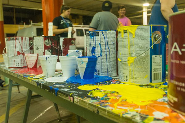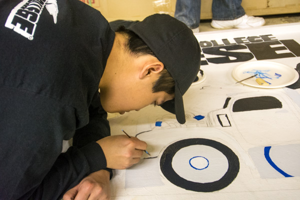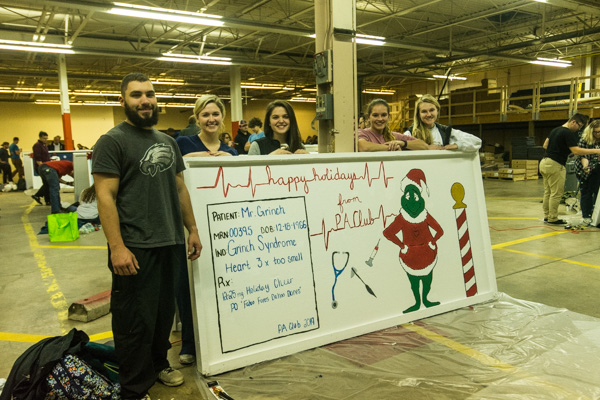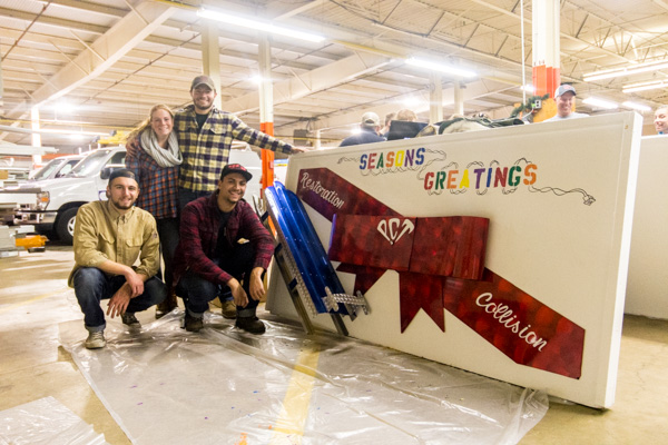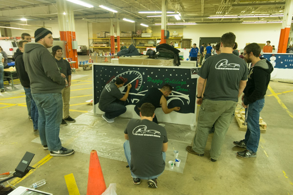 Wednesday’s card-decorating blowout in the General Services warehouse along Reach Road produced another assortment of holiday greetings from Penn College offices and student organizations. The 32-square-foot wooden cards will be installed Tuesday on the lawn between the Breuder Advanced Technology & Health Sciences Center and the Thompson Professional Development Center, and will be lighted at 5 p.m. Wednesday, Nov. 29. Prizes will be awarded by the Student Activities Office to the top three entries in each of the two categories.Photos by J.J. Boettcher, student photographer