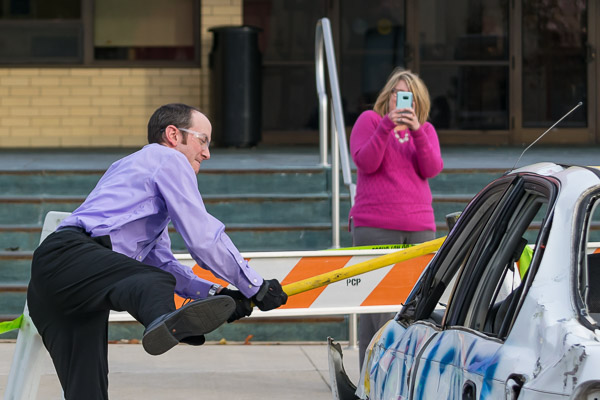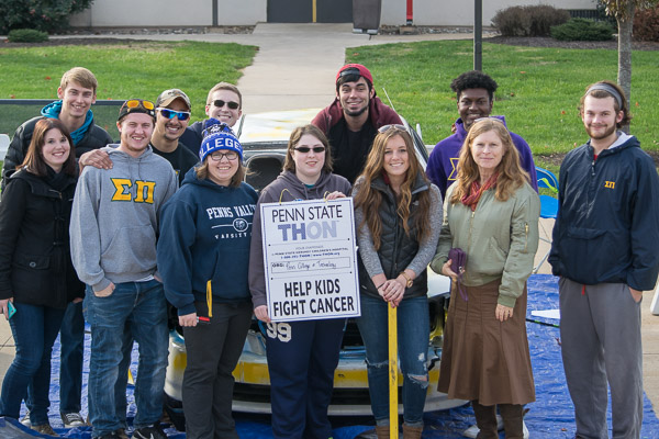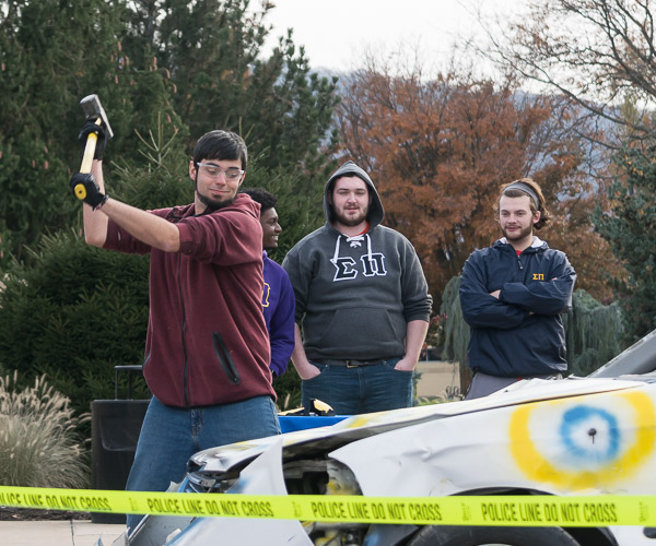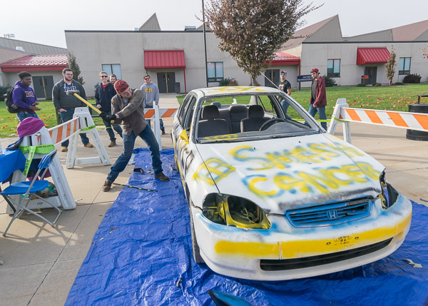 A "car smash," a traditionally entertaining (and stress-relieving) campus fundraiser since the Fall 1970 semester at Williamsport Area Community College, was updated this month to benefit the fight against pediatric cancer. Penn College Benefiting THON, a student organization allied with the annual February dance marathon at Penn State, raised $120 from people taking a swing or two at a donated vehicle. All proceeds benefit the Four Diamonds Fund at the Penn State Hershey Children's Hospital, providing a variety of financial assistance for families and children going through cancer treatments. "Most importantly, the funding goes toward research happening every day to try and find a cure," said organizer Rylee A. Butler, an engineering design technology student from Bellefonte. "We would also like to say, 'Thank you so much' to everyone who supported this great cause and a special thanks to the Sigma Pi brothers for helping make the fundraiser a success."Photos by Tia G. La, student photographer