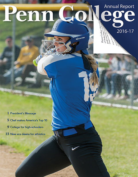 Read Penn College’s 2016-17 Annual Report, available online and hitting mailboxes soon. The issue features a message from President Davie Jane Gilmour, and stories about the college’s Penn College NOW dual-enrollment program, its foray into NCAA Division III athletics, and the prestigious “Top 10” honor bestowed on a faculty member. Also find reports on the 2016-17 budget, gifts and donations, and college award winners.