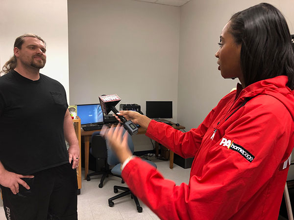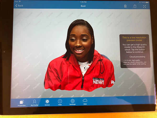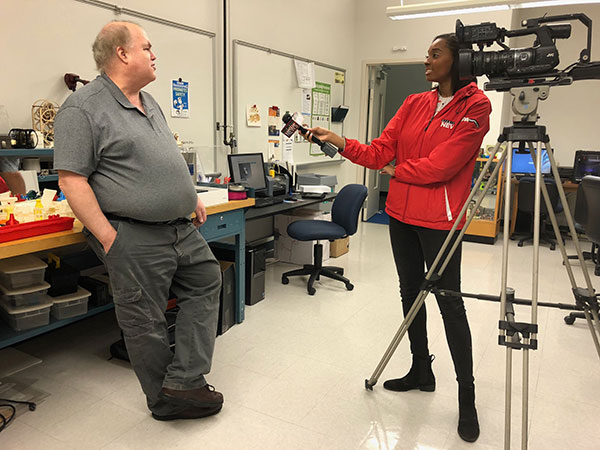 Eyewitness News reporter Morgan Parrish visited Penn College's rapid prototyping lab Wednesday for a story about National Engineers Week. She interviewed Eric K. Albert, associate professor of machine tool technology/automated manufacturing, and Anthony M. Passaro, a manufacturing engineering technology major from Williamsport. Parrish received a 3-D scan of herself during the visit, courtesy of Albert. The piece aired during evening newscasts.Photos by Tom Speicher, writer/video editor