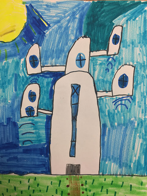 A description of Lanzoni’s artwork, submitted by his art teacher, Julie Marx, reads: “On the inside of the long rectangular window is an elevator, and it can take you to any floor. Each room hangs off the main part of the house, which makes it unique and different.”