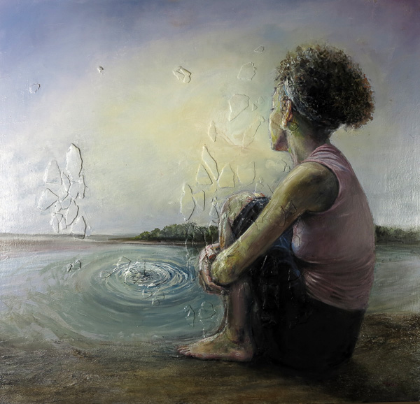 Peck uses an individual model in each of her pieces, created with oils and imbedded gessoed plaster shards. The singular subject represents a life’s broken path.“I’m looking for the binding power opposite of mob mentality – our mutual connections. Although we can all be overwhelmed and feel helpless, the human spirit always possesses hope, even in the most desperate of circumstances. I would be happy if I can show a glimmer of our broken yet beautiful human experience.”