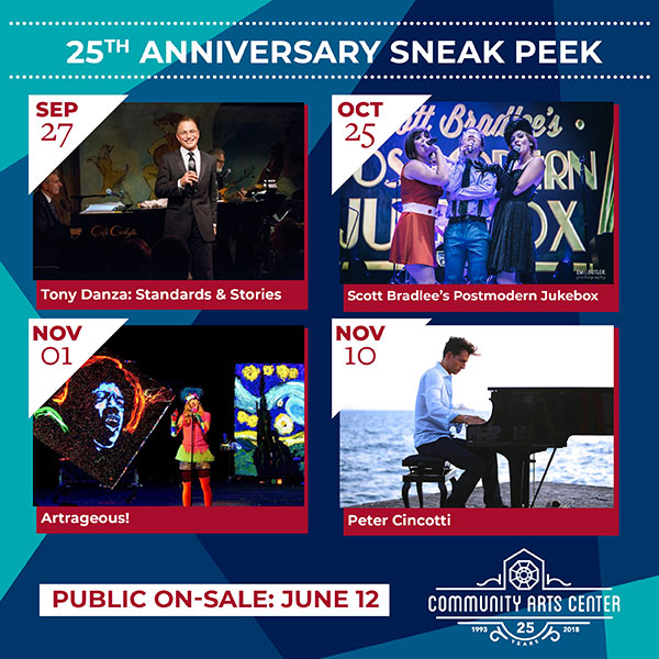 The Community Arts Center kicked off its 25th anniversary with a "sneak peek" at the season's first four performances, promising an outstanding lineup that is as interesting and diverse as its audience members: "Tony Danza: Standards & Stories" (7:30 p.m. Thursday, Sept. 27),"Scott Bradlee’s Postmodern Jukebox" (7:30 p.m. Thursday, Oct. 25), "Artrageous!" (7:30 p.m. Thursday, Nov. 1), and Peter Cincotti (7:30 p.m. Saturday, Nov. 10). Members' pre-sale will begin June 5; sale to the public starts June 12. Tickets may be purchased at the CAC website, by phone at 570-326-2424 or at the Arts Center box office.