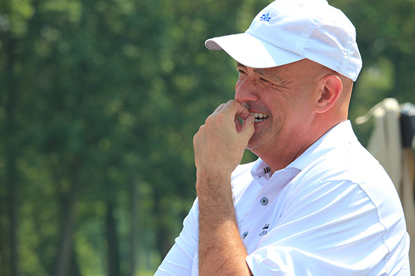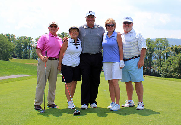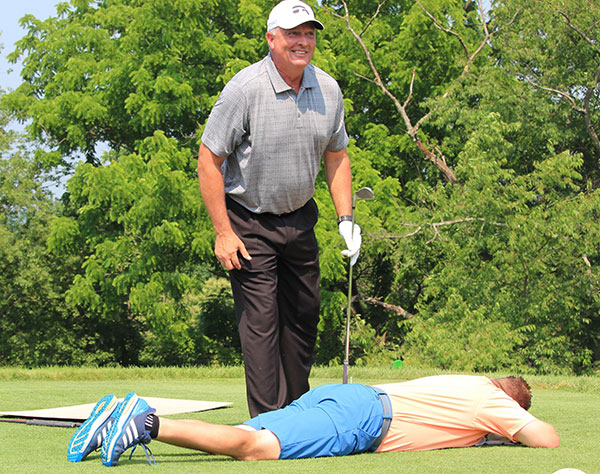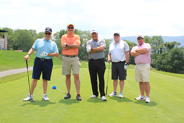 A playful pose by a group that includes Golf Classic Committee member John Confer (at arm's length) and co-chair Paul Rooney (second from right).