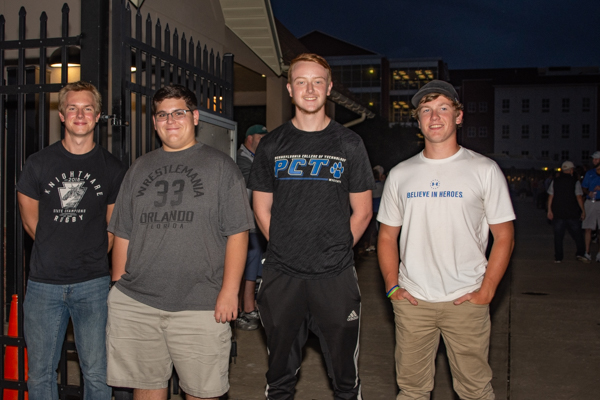 "Last to the meeting, first to the gate" was the unofficial opening-night motto for this quartet of freshmen, who, after a busy day of acclimation, inadvertently missed a housing session but arrived in time to head the procession.