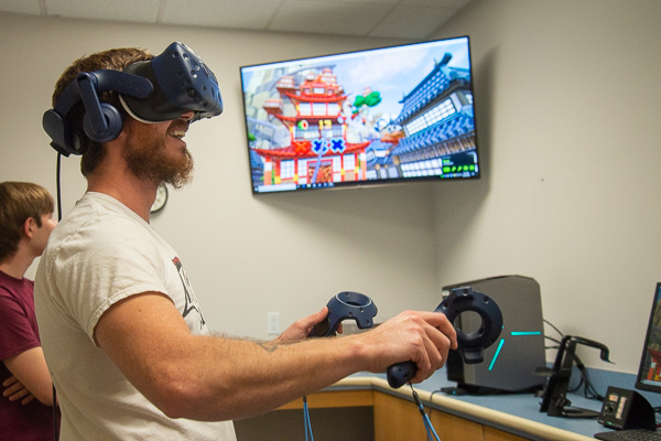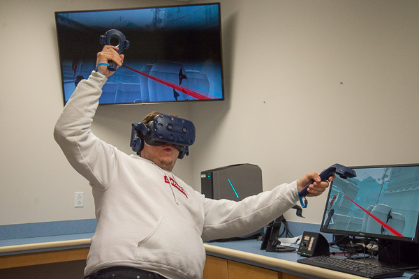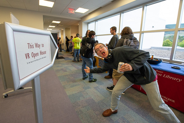 Penn College's new Virtual Reality Studio was officially opened Thursday afternoon and was an immediate hit, as patrons – animatedly visiting other worlds without leaving campus – lined up in the rear second-floor hallway of Madigan Library for 10-minute sneak peeks. The Office of Instructional Technology, in collaboration with the library, designed and built the studio to allow students, faculty and staff to connect learning, exploring and interacting with information and media in a simulated hands-on environment. "We wanted to lower the barrier of entry to using VR and provide a space where students and faculty can explore and create without having to pay the high price tag of a VR system themselves," said Tracey Amey, library director. "Health Sciences students can explore what happens to cells as they travel through the body. Engineering students can experience flying into space beside astronauts in a manned space rocket, and gaming and simulation students and faculty have a new 3D environment in which they can create." The studio is a space for experimenting with realistic and immersive content in a three-dimensional environment experienced or controlled by movement of the body. It is equipped with the HTC Vive Pro VR system, the latest generation of VR technology, and an Alienware Aurora computer to ensure the best in performance and functionality. The VR Studio is also equipped with a 55-inch monitor mounted inside and a 42-inch monitor outside to allow visitors to watch the action. Flyers with QR codes enable visitors “to learn about the equipment, safety instructions and other helpful information” and to “see the Madigan Library Research Guide and learn more about Virtual Reality.” Students can reserve time in one-hour increments at the circulation desk from 3-10 p.m. Sundays through Thursdays; faculty can book the studio upon request through OIT.