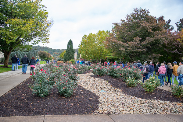 Pedestrian traffic moves northward on the campus mall as families endeavor to take it all in.