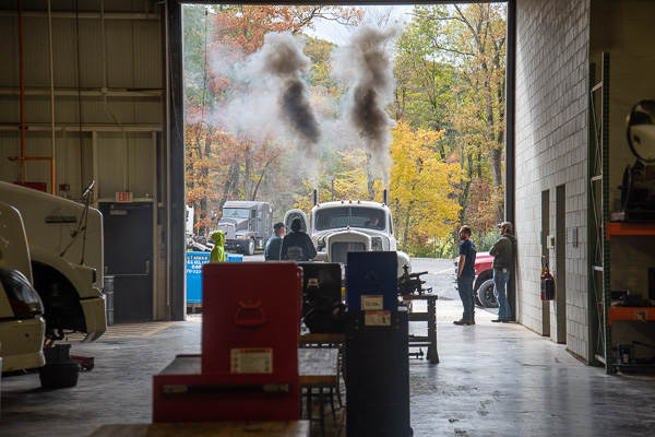 Smoke billows from the 1959 Mack “drag truck” in the diesel lab.