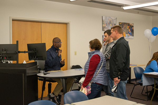 Amid walls displaying student work and a video featuring 2007 alumnus Nicholas D. Biddle, visitors hear from Brian A. Flynn, assistant professor of graphic design, and other art faculty.