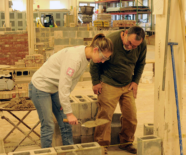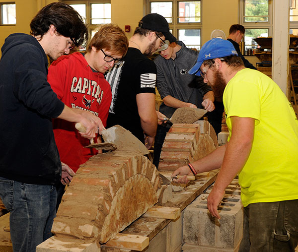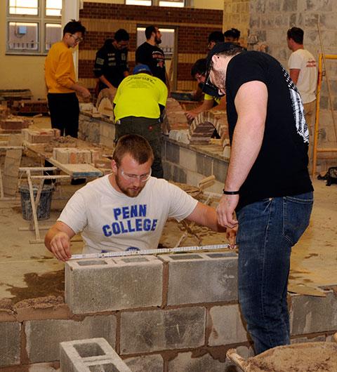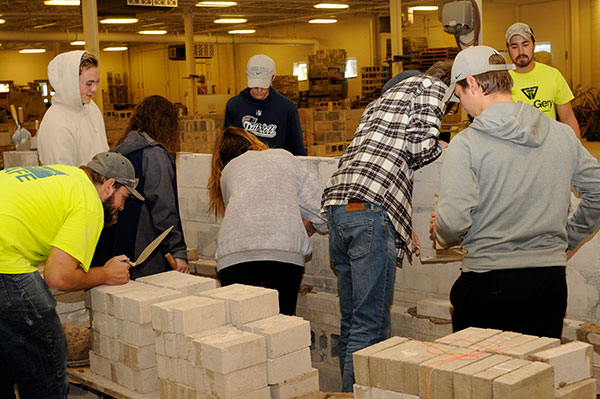 More than 30 landscape architecture students of David Goldberg and Marc Miller, assistant professors in Penn State's Stuckeman School, visited the Construction Masonry Building on Thursday. The day's guests received hands-on instruction in a variety of technique and materials, circulating among workstations and mentored by adept Penn College construction students. Instructors Robert P. Gresko and Glenn R. Luse rotated along with them, sharing encouragement and expertise, and industry supporters aided the cause – including Spec Mix, which is also supplying mortar for the nearby expansion of welding labs. Architecture majors from University Park visit the college's School of Construction & Design Technologies twice a year, getting practical exposure to the craft involved in bringing their visionary plans into focus.