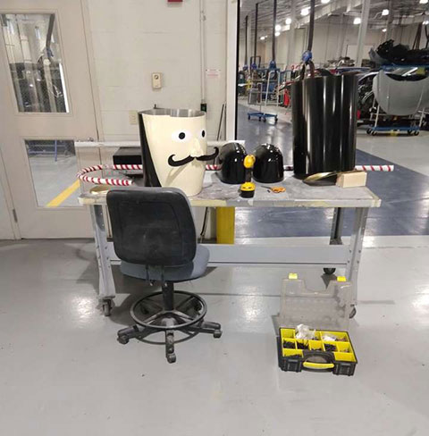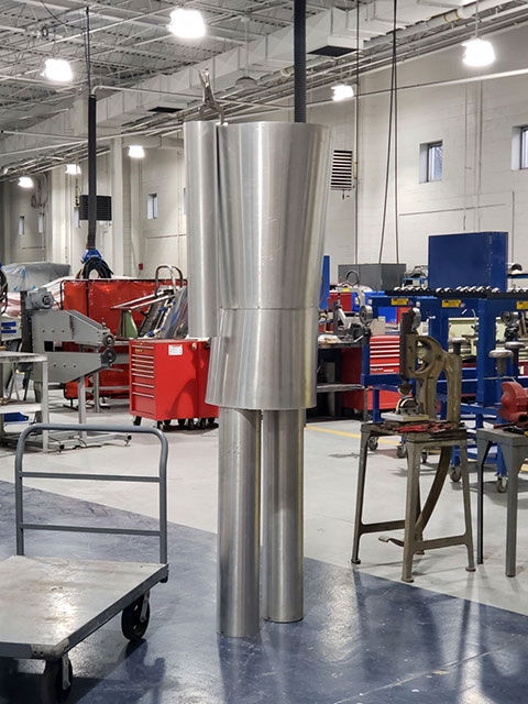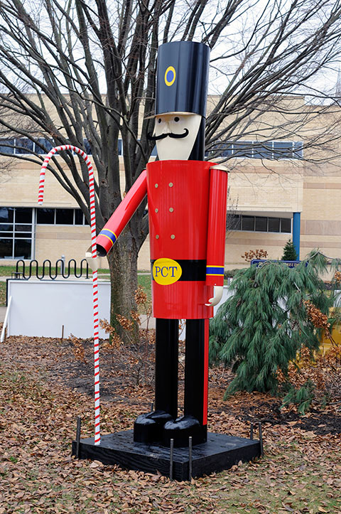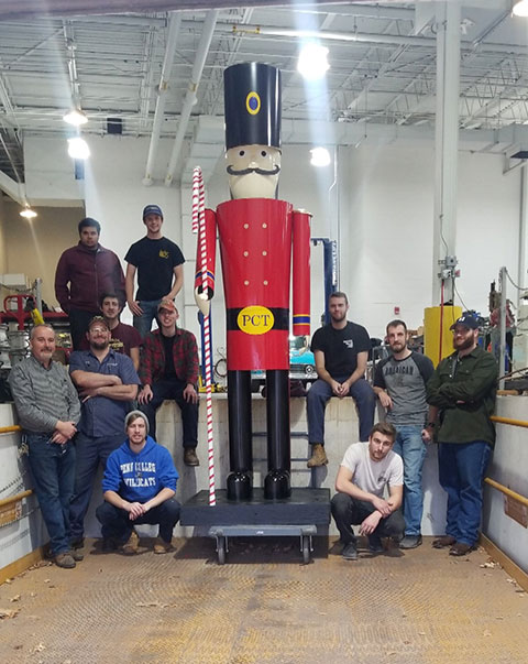 Penn College's decades-old tradition of large-scale holiday cards on the campus mall got an impressive add-on for the 2018 season: a massive toy soldier jointly fashioned by automotive restoration majors and manufacturing students in instructor Roy Klinger's metal-shaping classes. "We were trying to think of something we could build to go with the holiday cards, and we came across an image of a 12-foot-tall toy soldier," said Arthur M. Wright IV, an automotive restoration technology major from Woodbridge, New Jersey. "We figured we would give it a try because it could end up looking really cool!" A group of students from the manufacturing program assisted restoration majors with drawing and designing the toy soldier. The inner structure is mostly plywood arranged to help support the weight of the towering statue, Wright said, while the outer shell is completely made of aluminum. "The restoration students made paper patterns of the shapes provided by the drawing that the manufacturing students prepared for us," he explained. "We then shaped all the pieces using the skills and techniques that we were learning in our metal-shaping class. The project really helped us display the skills that we had been working so hard to develop." It was a total team effort to complete the project, he said, estimating that it took all of four three-hour classes to fully realize their shared vision. "When we came in the Wednesday morning of the card-lighting ceremony (Nov. 28), we didn't think we were going to be able to get it done," said Wright, who also shared some of the students' photos. "Most of the soldier was still in pieces, with no paint. But thanks to the guidance and leadership of our teacher, we were able to get everything finished before the ceremony started!"