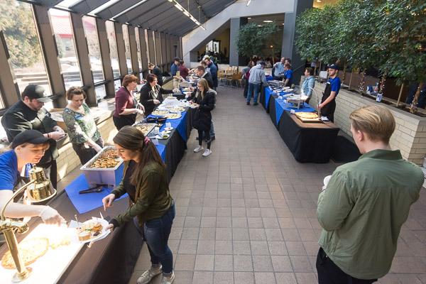 Dining Services held a "Recipe Showcase" Thursday afternoon, distributing free samples of new dishes coming to campus dining units in the Fall 2019 semester. Among the items taste-tested by students in the Keystone Dining Room were carved pork prime rib with "secret weapon sauce," horseradish-crusted salmon, dill pickle fried chicken sandwiches, Cajun chicken cheesesteak pizza, Maui chicken naanwiches, Sriracha turkey naanwiches, pasta e fajioli, chicken waffle sliders, cauliflower-crust cheese pizza, pancake roll-ups, ancient grains, honey citrus carrots, Waldorf farro grain salad and edible chocolate chip cookie dough.Photos by J.J. Boettcher, student photographer
