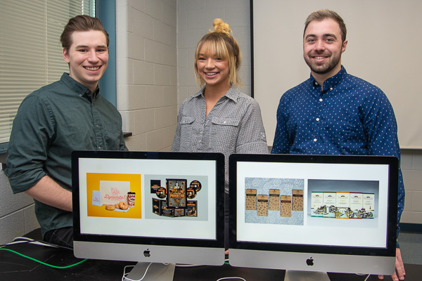 Graphic design seniors capturing awards are: Brandon M. Wolff, of Effort, “Best in Category Packaging” for Trailblaze Chocolates; Luke A. Bierly, of Centre Hall, “Merit Award in Packaging” for Prohibition DVD Set and “Merit Award in Identity” for Dynamite Doughnuts Brand Elements; and Alexis M. Botek, of Pottsville, “Merit Award in Packaging” for Brown Bear Chocolates.