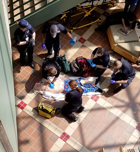 Paramedic students work through an emergency scenario in the ATHS atrium, treating a manikin so lifelike it drew double takes when transported down the campus mall!