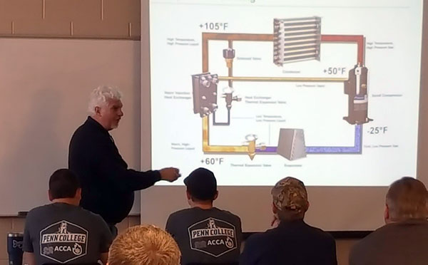 Through support from Makdad Supply Co. Inc., two Penn College students and an instructor recently attended an Emerson Compressor Operation and Service Seminar at the Central Pennsylvania Institute of Science and Technology. While heating, ventilation, air conditioning and refrigeration contractors from across the region attended the event – an in-depth, three-day program packed with everything an HVACR service technician needs to know to install, service and maintain Copeland compressors – Makdad sponsored seats for HVACR majors from CPI and the two students from Penn College. Among attendees were Ronald J. Ostrowski III, of Shavertown, and Zeph L. Woelfel, of Kersey, graduating next month with associate degrees in heating, ventilation and air conditioning technology, and Stephen D. Manbeck, an assistant professor of HVAC technology. Company owner Jack Makdad met with Manbeck and CPI's Ken Hassinger to discuss how to provide similar training, as well as access to a variety of vendors and industry resources. The institutions already share a strong connection through the Penn College NOW dual-enrollment program. That initiative allows high school seniors to earn up to five college credits while enrolled at CPI, credits that help them get a head start on an associate degree at Penn College.Photos provided