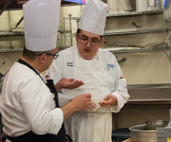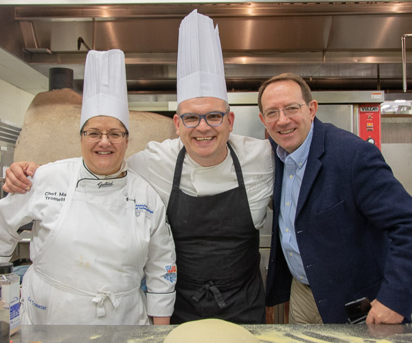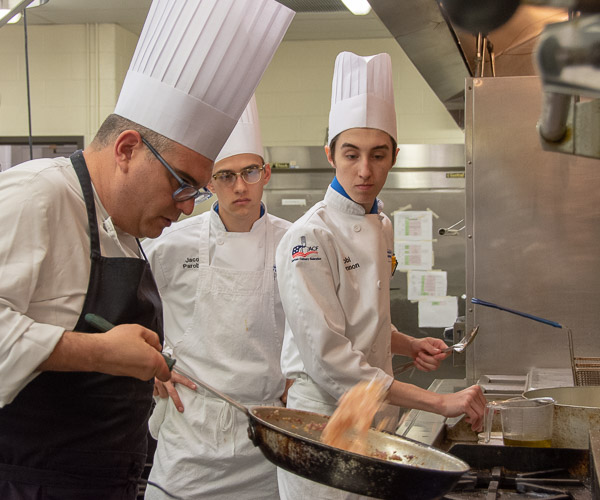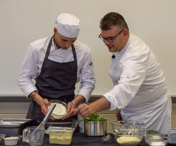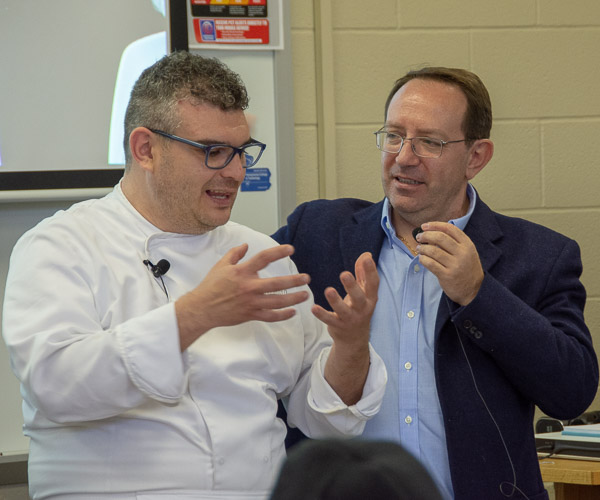Chef Felice Santodonato and Giacomo Berselli, president of Marco Polo Study Abroad, made a visit to campus April 24-25 to work alongside hospitality students and provide information on a study abroad course in Italy beginning in 2020. On Wednesday, Santodonato, of Ceccano, Italy, provided students a demonstration and tasting of “Cucina Ciociara,” the cuisine of his region. Santodonato is a professor of science and culture of enogastronomy at the University of Rome. He was assisted by his student Lorenzo Stefanelli. On Thursday, the pair worked alongside students in Le Jeune Chef Restaurant to prepare an Italian meal for the public. In the May 2020 semester, the college will offer the course Global Food and Hospitality: Cuisine, Culture and Perspectives, a 14-day experience in Italy that includes hands-on cooking classes in four locations, as well as visits to hotels, vineyards, other agricultural sites, and vinegar and cheese producers, as well as cultural tours.