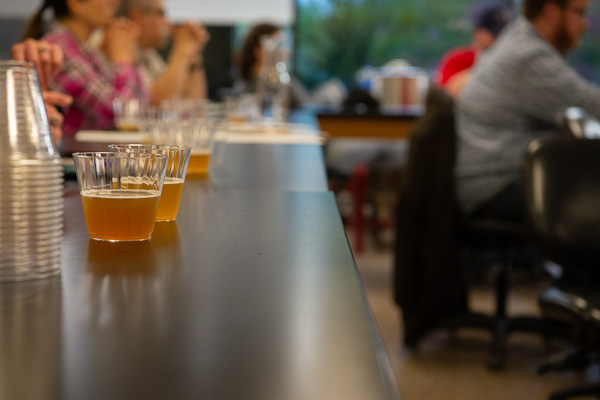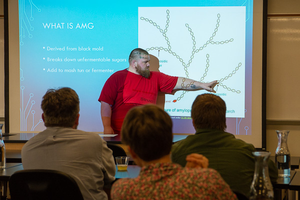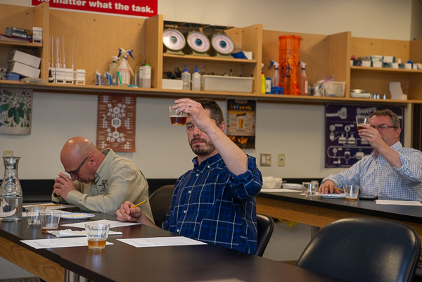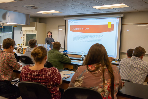 Among the recent capstone presentations held across campus, graduating students in Penn College’s brewing and fermentation science degree presented their culminating brews to an audience that included natural sciences and hospitality faculty. Two presentations were conducted, with the soon-to-be-professional brewers offering small assessment samples of their two final brews. “The primary goals of these events were twofold: one benefit to the students was to add feedback and commentary on their capstone beers from a random group of consumers to the feedback they received from the professional panels I assembled earlier in the semester,” said Timothy L. Yarrington, instructor of brewing and fermentation science. “Another was to expose the students to the challenge of engaging consumers about their beers and explaining the history, processes and rationale that inform their characteristic color, flavor and aroma. Brewers rely on professional and consumer feedback to inform their choices. We are also continually in a position to increase the beer IQ of the consumer through educational dialogue.” Six students will graduate May 17 with Associate of Applied Science degrees in brewing and fermentation science.