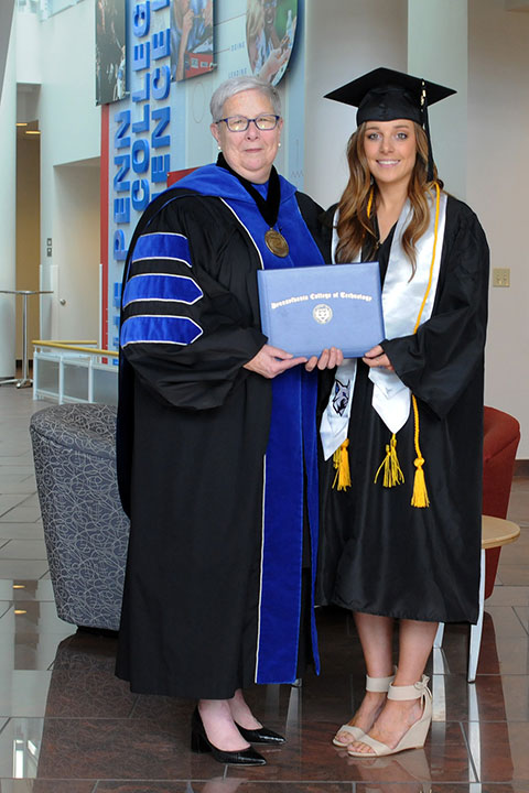 A graduation ceremony was held Wednesday morning for Rylee A. Butler, a member of the Penn College archery team who is unable to attend commencement exercises due to this weekend's U.S. National Outdoor Collegiate Championships in Ohio. President Davie Jane Gilmour presented the diploma to Butler, who earned a bachelor's degree in engineering design technology, during a brief gathering in the Student & Administrative Services Center. The building's lobby was filled with family and other well-wishers, including faculty from the School of Industrial, Computing & Engineering Technologies; as well as representatives of the Athletics Department, Academic Affairs, and the Admissions, Registrar and Financial Aid offices. In addition to her degree, Butler is receiving the Academic Vice President and Provost's Award and the Engineering Design Technology Faculty Award; she also was recently inducted into the college's new Chi Alpha Sigma honor society for student-athletes. Spring graduation often coincides with postseason play and, in recent years, the president has taken road trips to present diplomas so Wildcats didn't have to choose between commencement and competition.