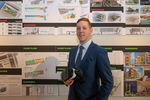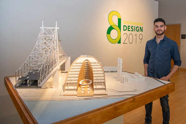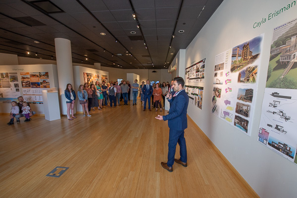 An institutional emphasis on green building was channeled by architectural majors into Penn College's first gallery exhibit of students' sustainable designs, which officially opened with a reception Thursday afternoon. “Sustainable Design 2019,” showcased on the third floor of Madigan Library, challenged students to design and develop a substantial project in an urban setting. Eighteen seniors in the college's building science and sustainable design programs rose to the task, drawing upon four years of immersive education to present capstones that skillfully encompass their processes, renderings and 3D models. The show, which runs through May 23, follows summer hours in The Gallery at Penn College: 10 a.m. to 5 p.m. Tuesdays through Thursdays; 10 a.m. to 1 p.m. Fridays; and 1 to 4 p.m. Sundays. (The gallery is closed Saturdays and Mondays.)