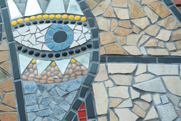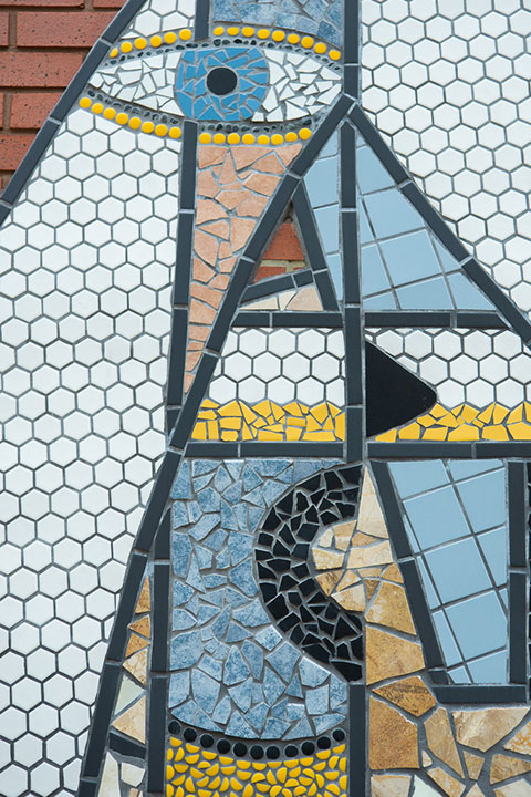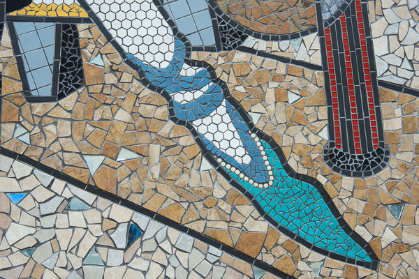 A mosaic, crafted by a member of Penn College's art faculty and featured as a work in progress during this month's First Friday activities in downtown Williamsport, has been completed. The dazzling, 144-square-foot attraction inventively weaves artists’ tools into the word “Arts,” and is the work of David A. Stabley, an instructor of ceramics and wood sculpture at the college, and Carol Cillo, president of the Clinton County Arts Council.