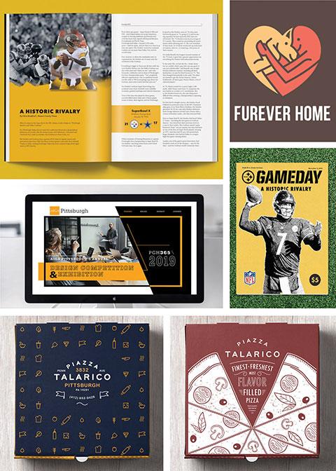 Five Penn College students captured six awards. Daniel Mendoza, of Rhinebeck, New York, received two honors: a silver in branding for his Furever Home logo and a design excellence award in the editorial category for his Game Day Program. Erin N. Shaffer, of Williamsport, earned a gold in digital for her landing page for PGH365. Jared S. Kosko, of DuBois, received a silver in editorial for his Game Day Program. In the miscellaneous category, two Piazza Talarico pizza box designs won honors: Gavin E. Hain, of Myerstown, silver, and Andrew Caccese, of Reading, design excellence.The designs were submitted in the Spring 2019 semester. Mendoza, Shaffer and Kosko graduated with Bachelor of Science degrees in graphic design in May. Hain and Caccese are seniors in the major.
