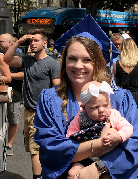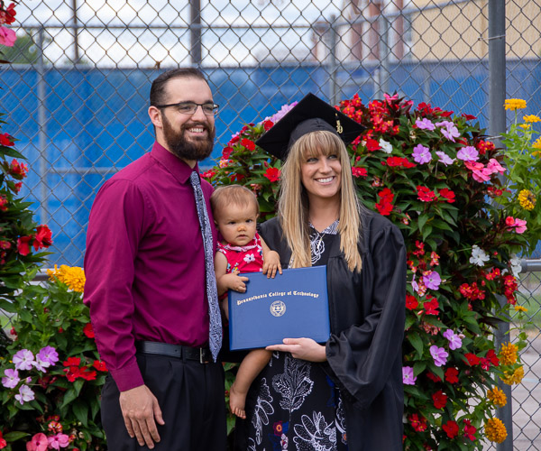 Bethany D. Schantz, of Northumberland, celebrates with her husband and daughter, who is ready to seize a degree of her own. Schantz has earned three degrees from Penn College: associate degrees in health arts: practical nursing emphasis (2011) and nursing (2016) and a bachelor’s degree in nursing (2019).