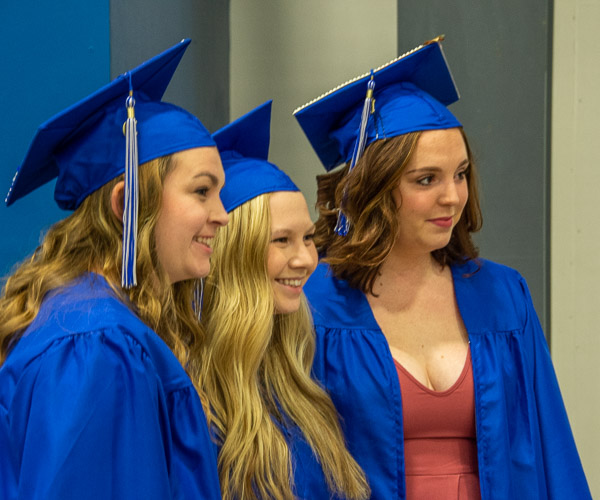Employees of the nursing department mark the occasion while waiting for new graduates to exit the Community Arts Center.