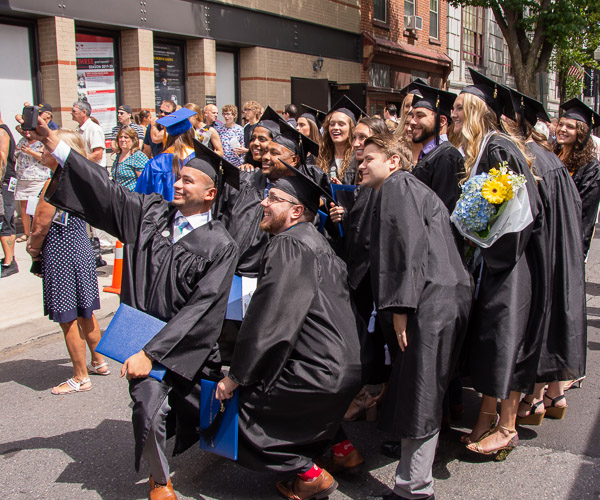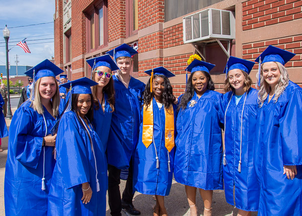 Graduates, who processed from the nearby Liberty Arena, acknowledge a photographer from alongside the Sun-Gazette building on West Fourth Street.