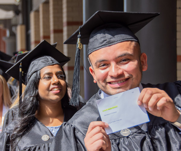 Physician assistant student Elvis A. Salas Alvarez, of Hagerstown, Md., shows off the card that will get him across the stage.