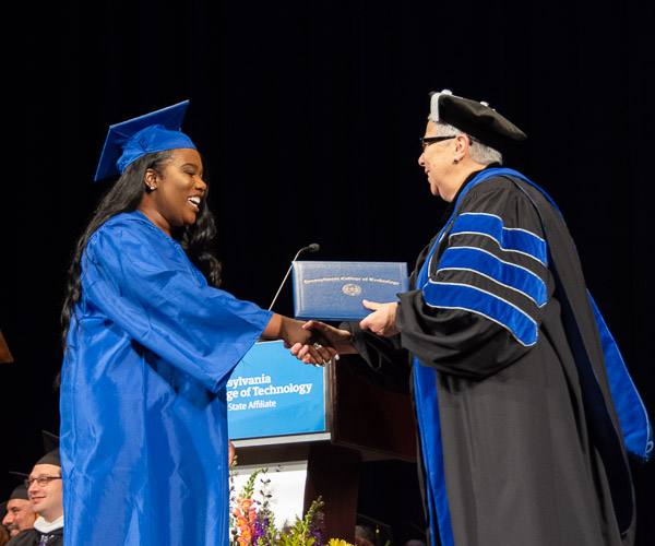 Taylor A. Krow, a radiography graduate – who, along with the day's student speaker, was a Wildcat "Athlete of the Year" – accepts best wishes from President Davie Jane Gilmour.