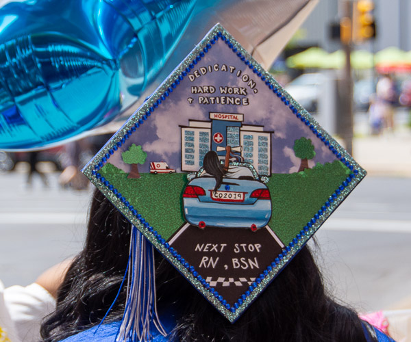 Philosophy – and battery-operated lights! – illuminate the cap of Mary L. Wagner, of Lock Haven, a graduate of health arts: practical nursing emphasis.