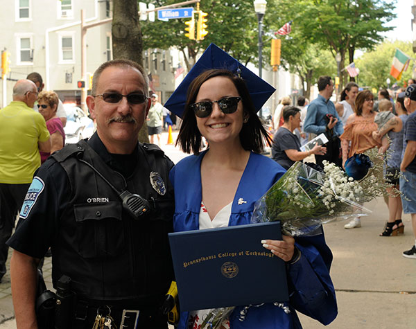 Proud Penn College Police Officer Charles E. O’Brien Jr. reconnects outside with his daughter, Aidan E., after she received an associate degree in health arts: practical nursing emphasis