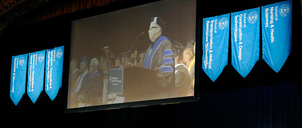 The overhead video feed, flanked by banners of the college's six academic schools, broadcasts the president's final remarks.