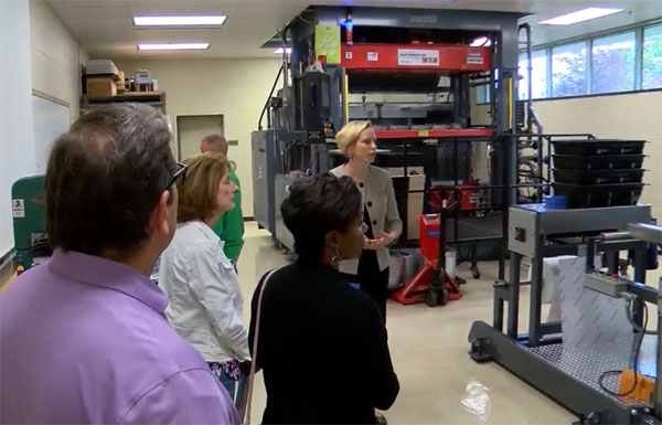 Site selectors for business and industry, who arrived in Williamsport late last week for a four-day assessment of the region's educational, health care and recreational attributes, visited Penn College on Monday. Led by a contingent of campus leaders, the guests toured plastics, automated manufacturing, welding, collision repair and automotive restoration labs, and enjoyed lunch at Le Jeune Chef Restaurant. Eyewitness News' Morgan Parrish was among those accompanying the group, and – in a piece that led the evening's 5:30 newscasts on WBRE/WYOU – interviewed Michael Quint, managing director at Newmark Knight Frank; Jared Grissinger, project manager for the Governor’s Action Team; and Jason Fink, president/CEO of the Williamsport/Lycoming Chamber of Commerce, for their perspective. Also included in the broadcast was footage of Elizabeth A. Biddle, director of corporate relations; David R. Cotner, dean of industrial, computing and engineering technologies; Shannon M. Munro, vice president for workforce development; and Spencer L. Cotner, of Muncy, a plastics and polymer engineering technology major and research assistant at the college's Plastics Innovation & Resource Center. The visit, which began at the Little League Baseball World Series over the weekend, concludes with Tuesday stops at UPMC Susquehanna and Lycoming College.