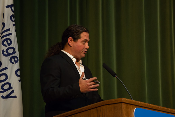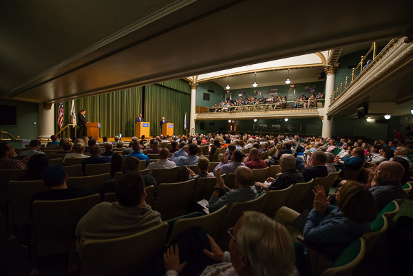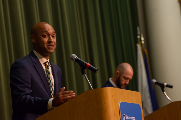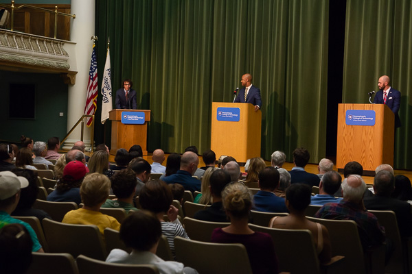 An engaged audience of Penn College students, employees and community members crowded into the Klump Academic Center Auditorium for Tuesday's debate between the two candidates in Williamsport’s mayoral race, sponsored by Penn College’s Student Government Association. In a 90-minute exchange moderated by Craig A. Miller, associate professor of history/political science, Republican Eric Beiter and Democrat Derek Slaughter discussed a variety of relevant issues and answered incisive questions from Miller and attendees alike. The event, which fittingly coincided with the college's Constitution Week observance, is recounted on the front page of Wednesday's Williamsport Sun-Gazette and in a FOX56 news report.
