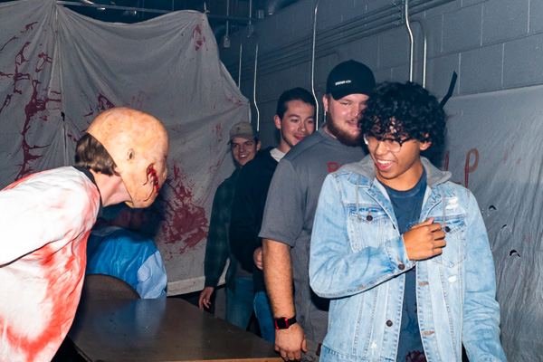 Friends hold onto each other in the "haunted" welding lab.