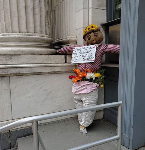"Flo the Florist," stationed outside the Williamsport/Lycoming Chamber of Commerce, directs visitors to a seasonal attraction.