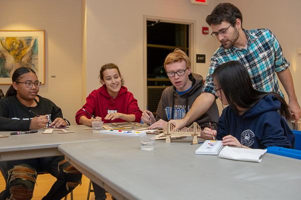 Repko interacts with students during a “Bridging the Gaps” workshop, where participants built bridges representing the past, present and future as they relate to the artist’s work.