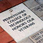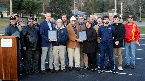 "God bless these students and their instructors," the manager of the Lycoming County Veterans Memorial Park project said this past weekend, presenting a pair of awards honoring Penn College's involvement with the expansive monument in Williamsport's West End. Army veteran John O. Markley offered those remarks early Friday evening during a brief, informal ceremony attended by a number of construction students and instructors Harry W. Hintz and Glenn R. Luse. He also thanked "two more people who made it happen" – college President Davie Jane Gilmour and Carol A. Lugg, dean of construction and design technologies – who helped the commission realize its 15-year dream by greenlighting the off-campus enterprise. Lugg and Michael J. Reed, vice president for academic affairs/provost, were presented with plaques "in grateful recognition of your enduring commitment and leadership to the ongoing improvements and expansion of the stone wall and memorial brick display" at the West Fourth Street park. Work continues at the site, which is scheduled to be dedicated during next year's Memorial Day weekend.