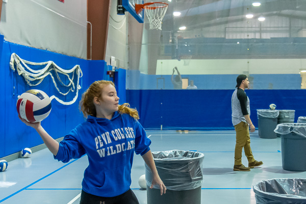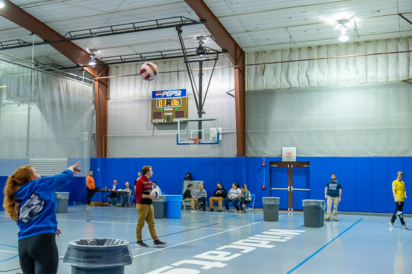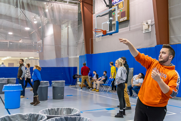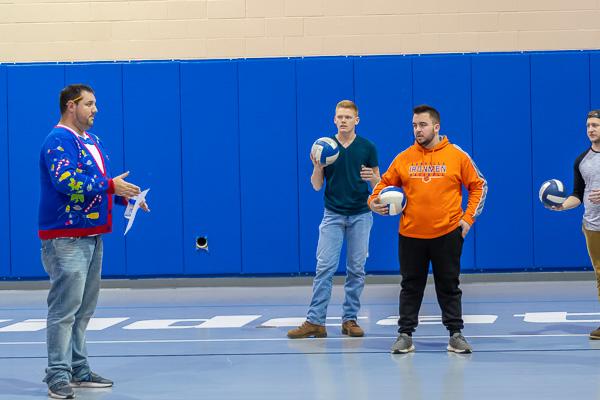 Students enjoyed a life-size pong game in the Field House this past week, trading pingpong balls and plastic cups for volleyballs and lined trash cans. In the double-elimination tournament, according to Jeremy R. Bottorf, coordinator of campus recreation, players had five minutes to clear all of the large “cups” (or the largest number of them) in the quest for prizes. Tie scores resulted in sudden death, with the player who eliminated the first "cup" moving on. In addition to intramural attire for the winners, everyone received a promotional basketball hoop and ball for participating. Competitors were invited to wear "ugly holiday sweaters," Bottorf said, although the timing of this year's event – falling before instead of after Thanksgiving – meant that students didn't have the opportunity to grab their favorite yuletide eyesores from home. Bottorf proved a good sport, however, choosing an apt example from his own collection!Photos by Tim Wegman, student photographer
