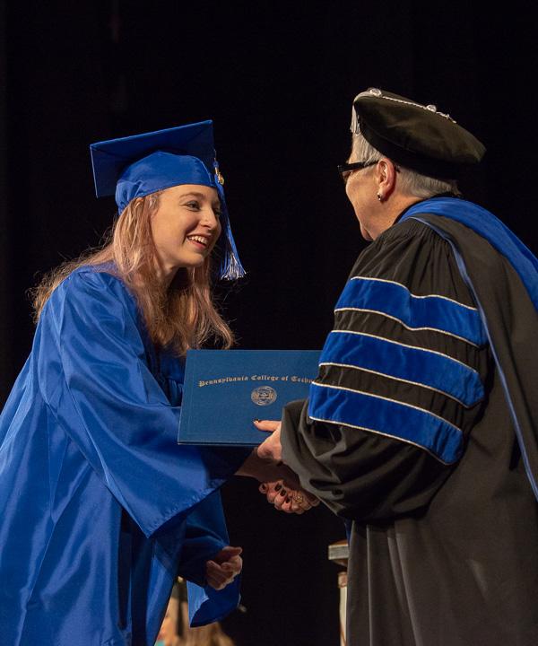 Justin W. Beishline, assistant dean of transportation and natural resources technologies, connects with Celeste G. Moquin, of Port Matilda, who graduated in on-site power generation and received the Pathfinders to Excellence Award.