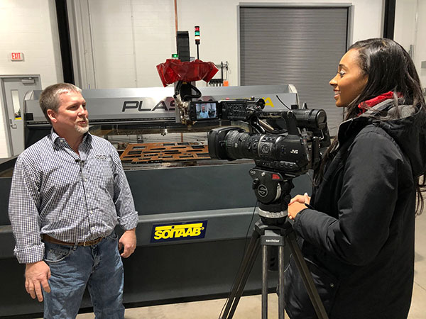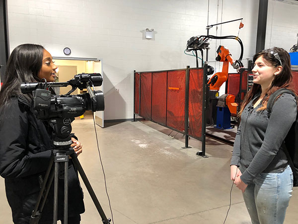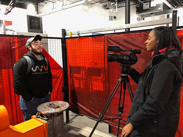 Eyewitness News' Morgan Parrish toured the expanded welding lab in the Lycoming Engines Metal Trades Center on Wednesday, interviewing instructor Michael R. Allen along with welding and fabrication engineering technology students Josiah D. Maenza and Cinnamon A. Digan. For her piece, Parrish donned a safety helmet and embraced just one of the hands-on opportunities that Penn College students regularly experience. "Adds welder to resume," she tweeted in advance of her report on WBRE/WYOU and pahomepage.com.