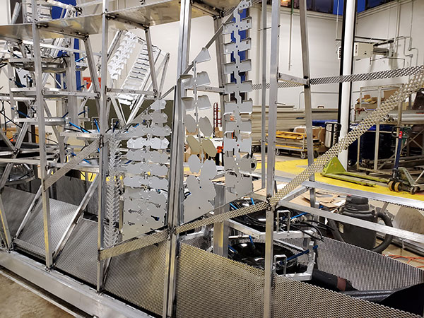 Based on Denny’s drawings, Jacob B. Holland, instructor of welding, led the effort to calculate the various lengths and angles of aluminum tubing required for each section and spent countless hours making the cuts. Colton; Cody W. Wolfe, instructor of welding; and a slew of other faculty and students applied nearly 5,000 1-inch welds to erect the structure.