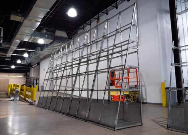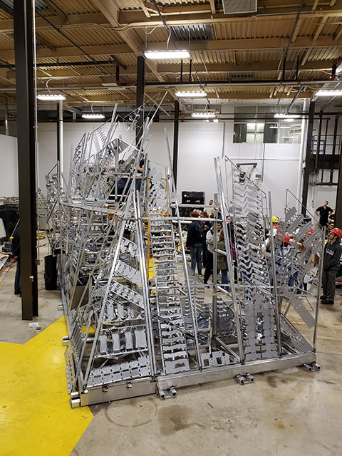 The unique angles of the Chime Wall take shape. Portions of the wall nearly touch the welding lab’s ceiling.