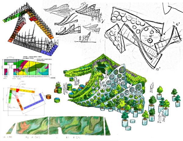 A collage of sketches illustrates the evolution of the Living Chapel’s design.