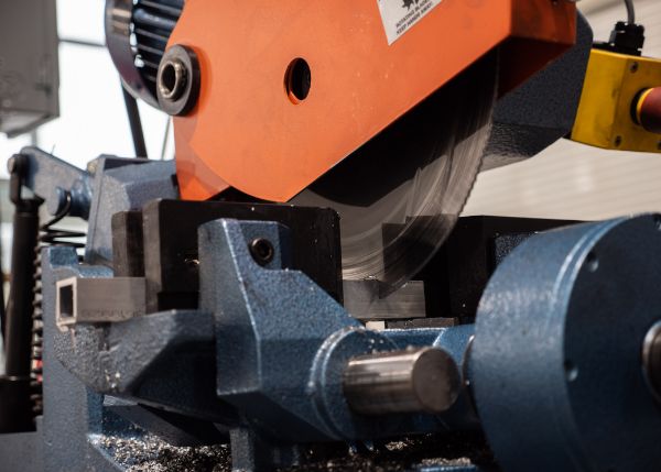 With the help of an electric cold saw, countless sticks of aluminum – measuring about 20 feet in length – are cut to build the Living Chapel.