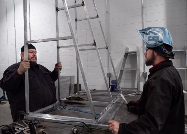 Welding students Nolan Durecki (left) and Christian A. Novick assist with grinding edges of the A Wall.