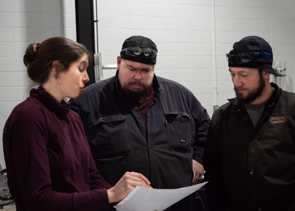 Gillean Denny, chief architectural designer for the Living Chapel, reviews some design changes with Holland and Colton. As a Penn State student in 2002, Denny visited the Penn College masonry lab with her classmates for a day of hands-on experience.