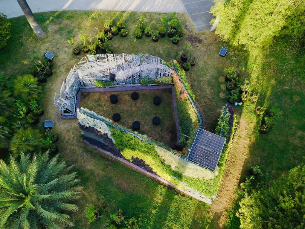 A solar-powered irrigation system nurtures the vibrant plants – perennials grown north of Venice – and helps “play” the vertically stacked steel pan drums located throughout the walls. Circulating water causes mallets to strike the drums, creating a natural melody. More than 2.6 tons of water are housed in the walls’ bases.